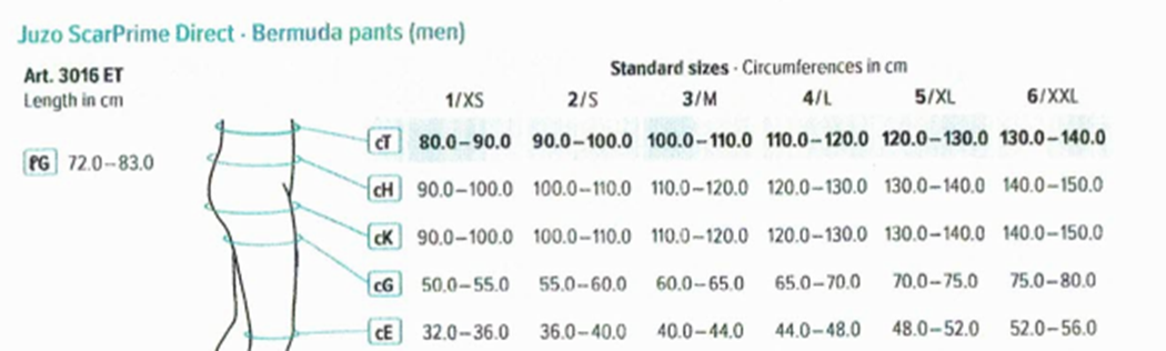 Juzo ScarPrime Direct leggings and bermuda pants are available in six standard sizes (from 1 – 6). The high cut with waist band additionally increases wearing comfort.